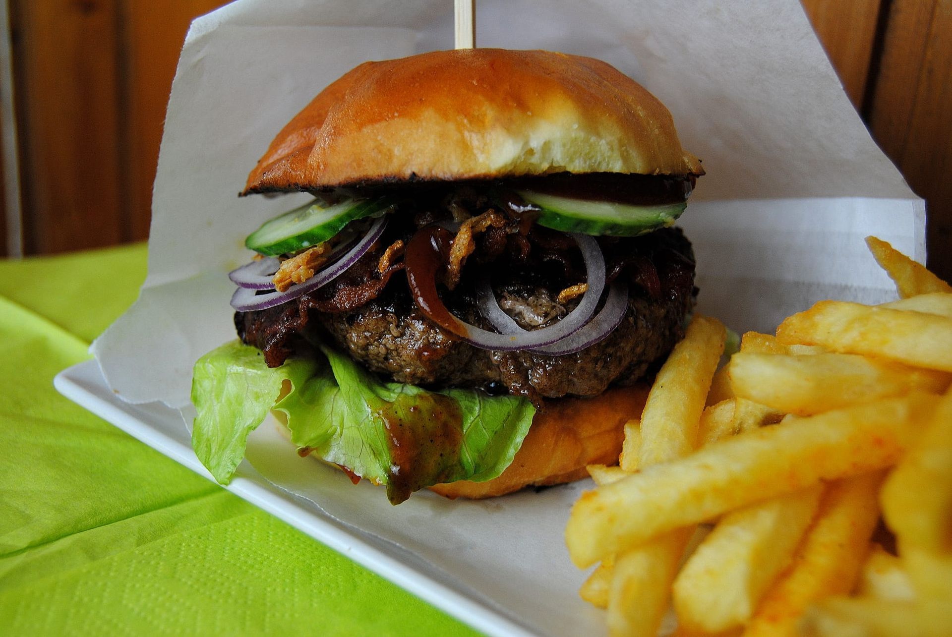 Brioche, 100% Rinderpatty, Barbeque Sauce, Bacon, Tomate, Salat, rote Zwiebel